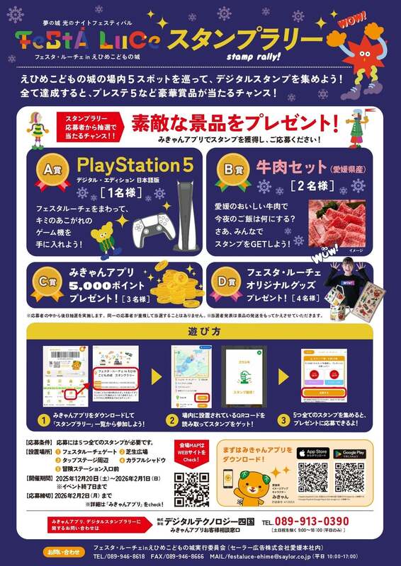すべてのスタンプを集めると、PlayStation 5デジタル・エディション日本語版や愛媛県産牛肉セット、フェスタ・ルーチェオリジナルグッズなど豪華賞品が当たるチャンスがあります。