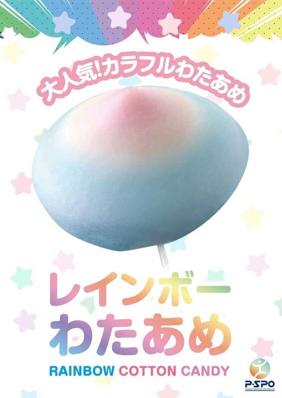 フィットネスブランドP・SPOが出店する飲食ブースでは、全自動で作られるレインボーわたあめを販売。スティックとカップから選べて、どちらも500円です。P・SPOのイベント出店の大定番で、SNS映え間違いなしですよ。