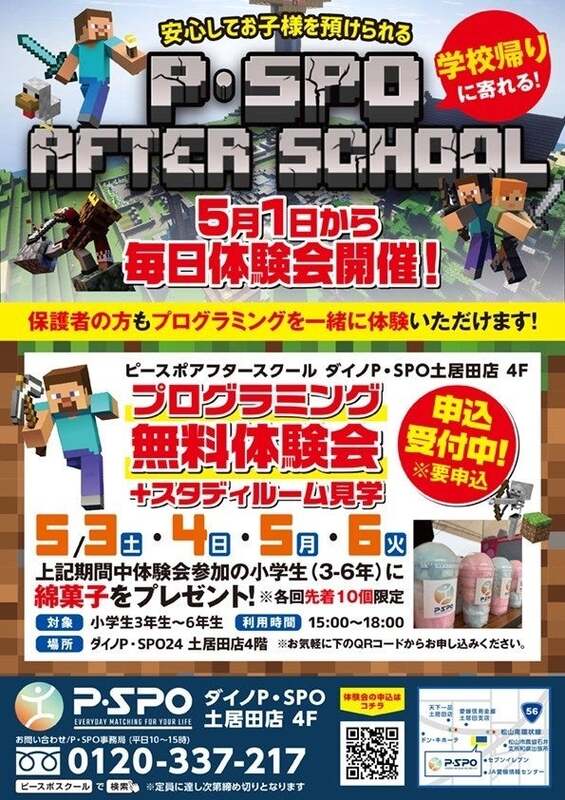 小学生向けには、プログラミングを中心に子供たちの創造力や考える力を育む「P・SPO AFTER SCHOOL」の体験ブースを、中学生向けには学校帰りに通える次世代型学習スペース「P・SPO STUDY+」の体験ブースを展開します。いずれも無料で体験できます。