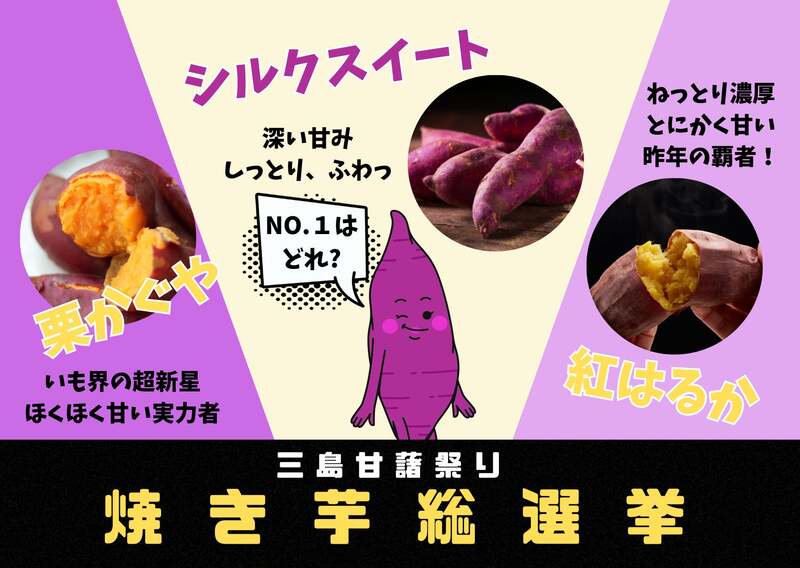 みしまるかん会場では、メインイベントとして「第2回焼き芋総選挙」を開催します。前回優勝したねっとり系の「紅はるか」、僅差で2位となったしっとり系の「シルクスイート」、初参戦となる「栗かぐや」の3品種が登場します。
