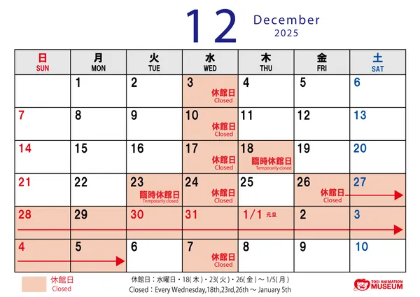 • 2025年12月29日(月)〜2026年1月4日(日):おやすみ