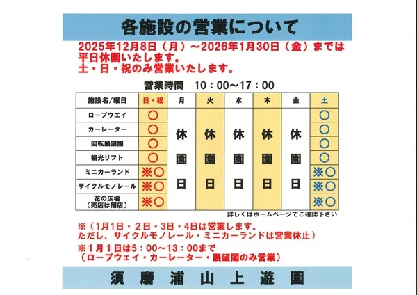 - 2026年1月1日(木・祝)〜1月4日(日):ミニカーランド・サイクルモノレールは営業休止