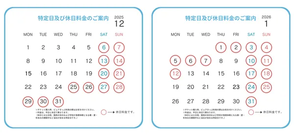 - 2025年12月29日(月)〜2026年1月4日(日):土・日・祝日料金