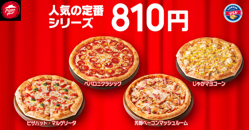 お持ち帰り限定で、定番の4種類のピザ(Mサイズ:2人前)が810円で楽しめます。つまり、1人あたりわずか405円という驚きの価格です。対象ピザは「ペパロニクラシック」「じゃがマヨコーン」「ピザハット・マルゲリータ」「芳醇ベーコンマッシュルーム」の4種類。通常価格1,860円のところ1,050円もお得になります。