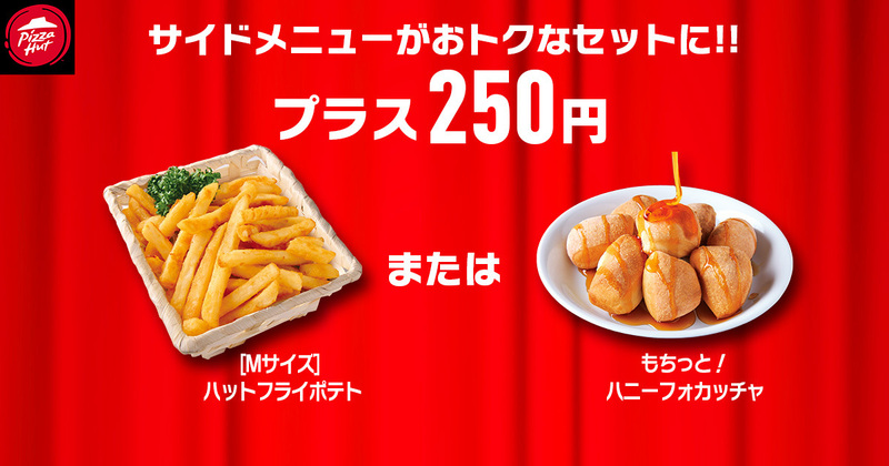 ハットの日対象ピザを購入すると、サイドメニューもお得に楽しめます。「ハットフライポテト」(Mサイズ)と「もちっと!ハニーフォカッチャ」(8個入り)が、通常価格500円のところ250円に。
