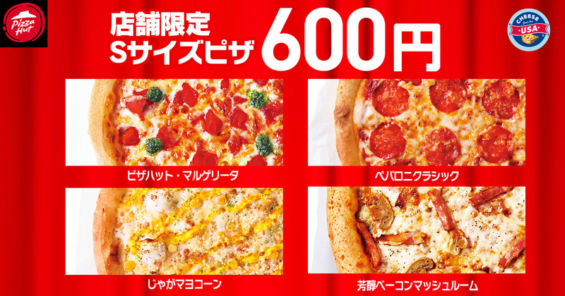 さらに、一部店舗では、「ピザハット・マルゲリータ」「ペパロニクラシック」「じゃがマヨコーン」「芳醇ベーコンマッシュルーム」のSサイズが600円で購入できます。通常価格1,400円のところ800円もお得なので、ちょっとしたランチや軽食にもおすすめですよ!