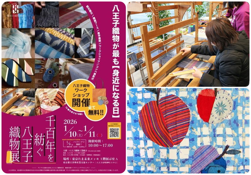 2026年1月10日(土)〜11日(日)に、「東京たま未来メッセ 1階展示室A」で「千百年を紡ぐ八王子織物展」が開催されます。八王子の伝統織物を「見て・触れて・感じる」ことを目的とした展示と、家族で参加できる多数のものづくりワークショップが無料で楽しめるイベントです。