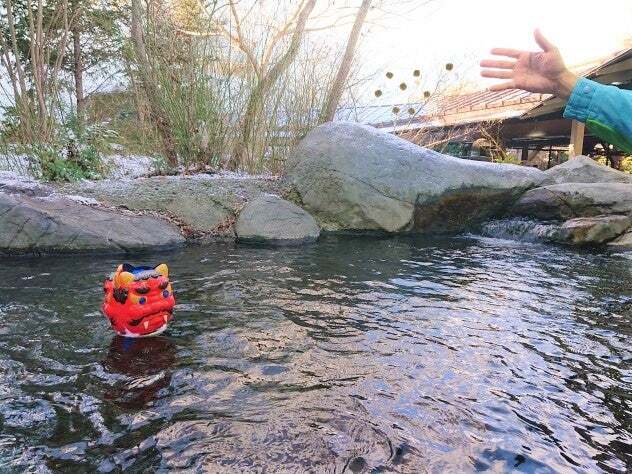不老長寿や出世の象徴として親しまれる縁起の良い魚・コイの水槽にも、鬼のお面が出現。カプセルトイで販売しているコイのごはんを豆に見立て、鬼の面に向かって"豆まき"体験ができます。親子でコイたちにごはんをあげて、福を呼び込みましょう!