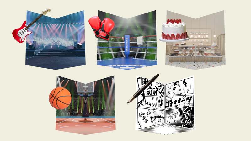 イベントでは、まず「バスケットボール」「ボクシンググローブ」「ケーキ」「ギター」「漫画用つけペン」の5つのアイテムから、自分の「やりたい!」を選びます。