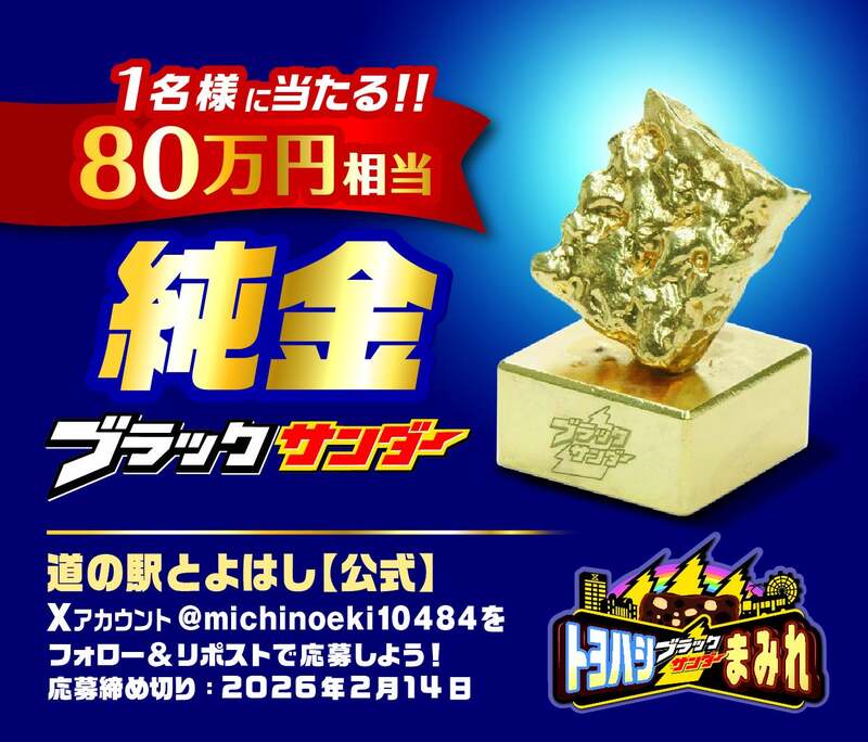 道の駅とよはしのX(旧Twitter)アカウントをフォローし、該当の投稿をリポストすると、80万円相当の純金ブラックサンダーが当たるキャンペーンに応募できます。