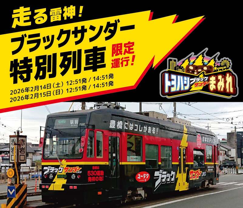 豊橋鉄道市内線(市電)で、ブラックサンダーにまみれた特別列車が2日間限定で運行します。