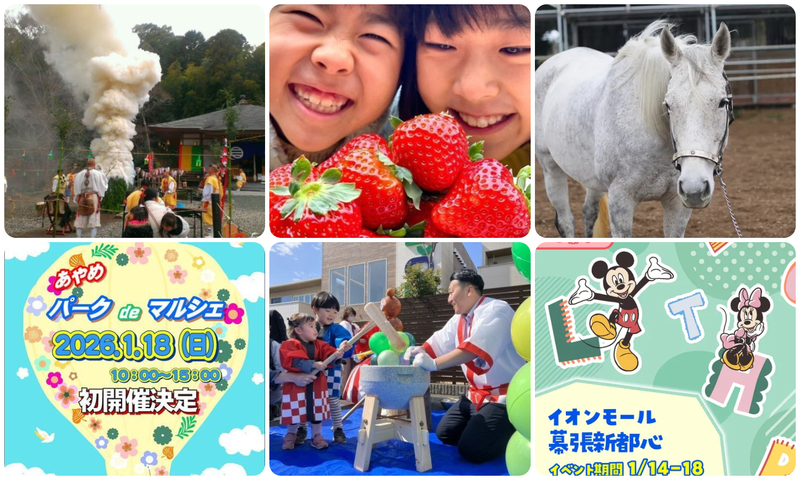 今が旬のいちごを味わえるお祭りや、今年の干支・馬とのふれあい体験、お正月ならではの餅つき大会など、大人も子供も楽しめるイベントがたくさん開催されますので、2026年1月17日(土)と1月18日(日)の週末も家族でおでかけを楽しんでくださいね!