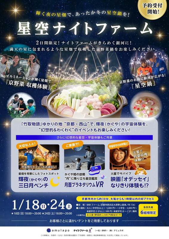 夜の畑で京野菜を収穫し、星空をテーマにした特製鍋や宇宙体験もできる、農業・食事・星空が一体となった特別なナイトイベントです。