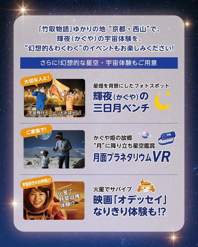 星畑と一緒に写真が撮れる「輝夜(かぐや)の三日月ベンチ」、かぐや姫のふるさと・月に降り立つ「月面プラネタリウムVR」、映画『オデッセイ』の世界観を再現した火星でのなりきり体験など、子供から大人まで楽しめる内容です。