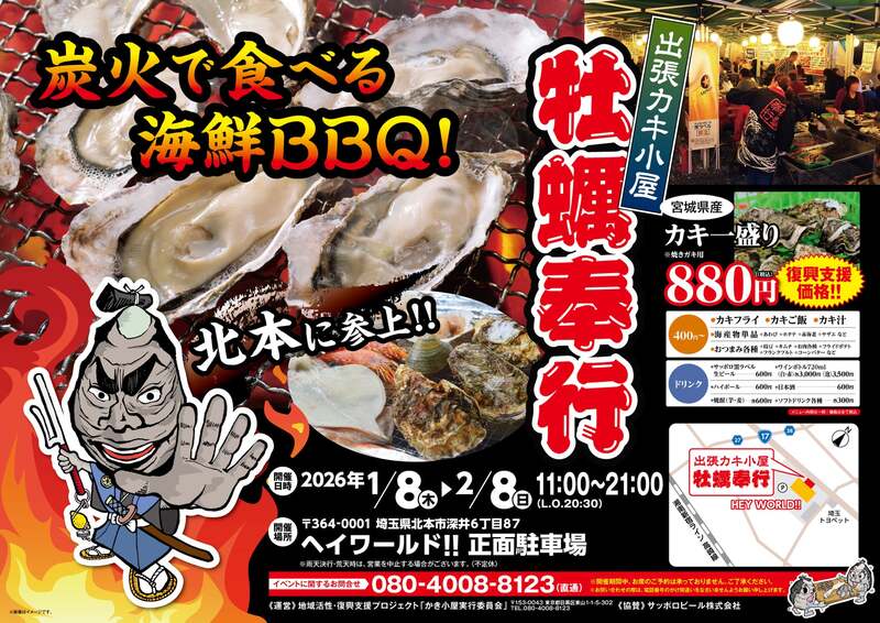 埼玉県北本市の「ヘイワールド!!北本」正面駐車場で、2026年1月8日(木)〜2月8日(日)まで、「出張カキ小屋 牡蠣奉行(かきぶぎょう)」が開催されます。