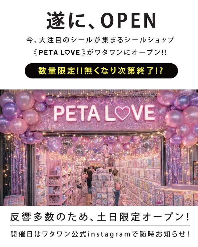 大阪府岸和田市のWHATAWON(ワタワン)に、シール専門店「ペタラブ」が、2026年1月17日(土)にオープンします。