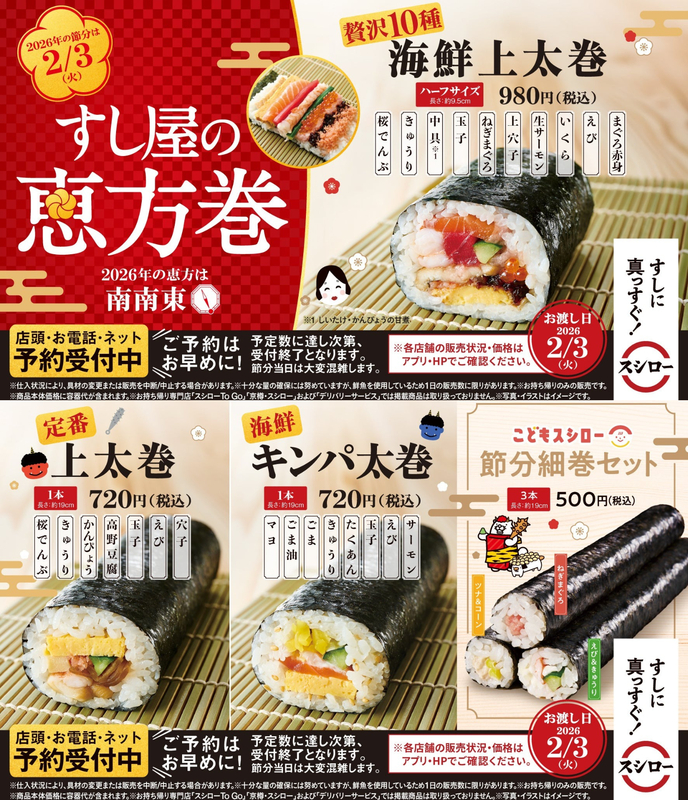 「活魚廻転寿司にぎり長次郎」「廻転寿司CHOJIRO京都」で購入できる恵方巻一覧