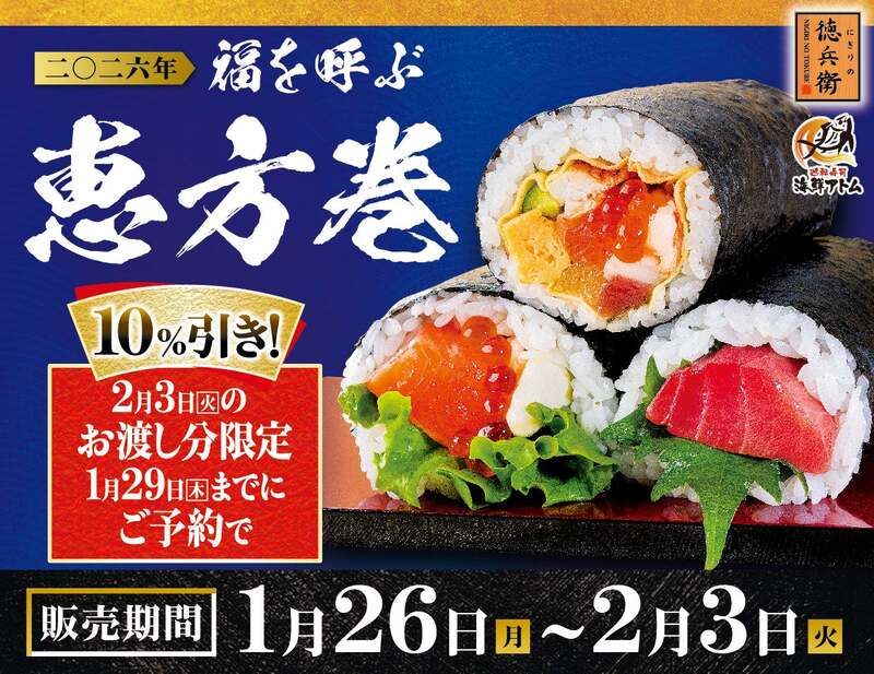 目玉は、銀座の銘店「鮨よしたけ」監修の看板商品。2026年は「太くて食べにくい」という声に応えて量目を見直し、よりお求めやすい価格にリニューアルされました。また、2026年にちなんだ「26種類の具材」を巻いた超巨大な恵方巻や、自分で巻いて楽しむ「タコス恵方巻」など、家族で盛り上がれる新提案も注目です。