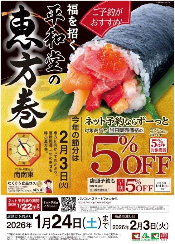 引渡しの日の前日までに予約すると5%OFFになります。願いを思い浮かべながら巻き寿司を丸かぶりして福を巻き込みましょう♪