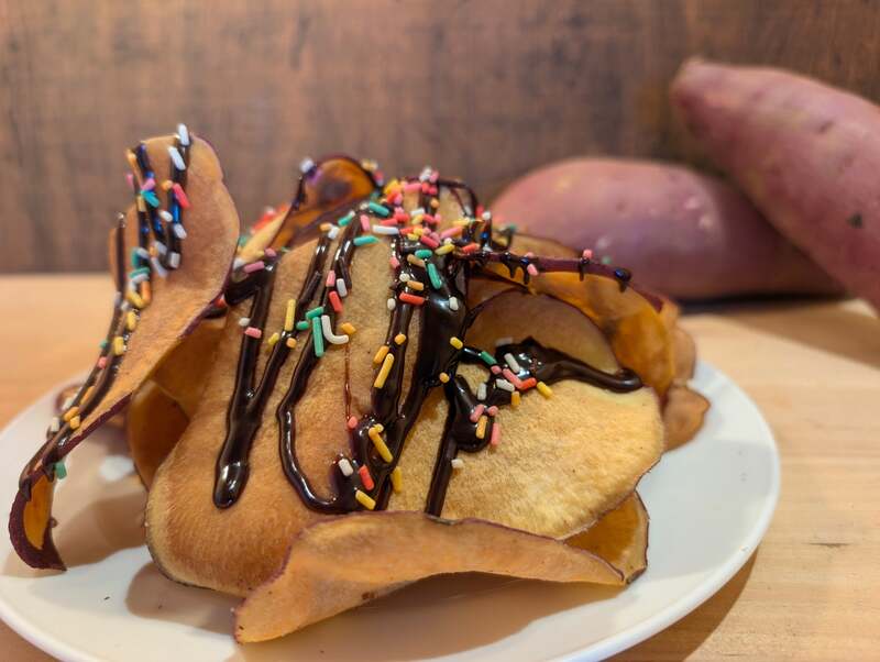 芋ばっかりの専門店IMOBAKKAの「紅あずまの蜜かけチップス チョコまみれ」は、カラフルなチョコでトッピングされた人気メニューです。