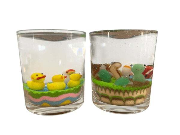 キャンドル作りでは、グラスの中に色鮮やかな砂を敷き詰め、カエルやカメ、すみっコぐらしのキャラクターなどのガラス細工を配置して、世界にひとつだけのキャンドルが作れます。