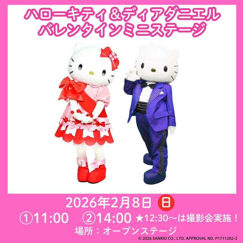 2月8日(日)には、ハローキティとディアダニエルが登場するバレンタイン限定のミニステージが開催されます。オープンステージにて11:00〜と14:00〜の2回、各回約20分程度のステージが楽しめます。