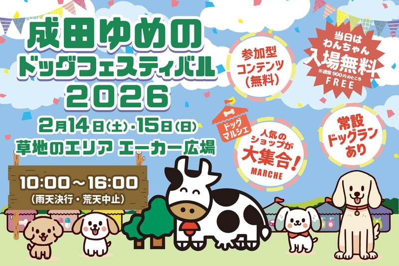 千葉県成田市の成田ゆめ牧場で、2026年2月14日(土)〜2月15日(日)に、第3回目となる「成田ゆめのドッグフェスティバル」が開催されます。