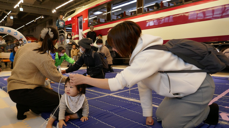 歴代ロマンスカーを背景に約60人の赤ちゃんがレースに挑戦