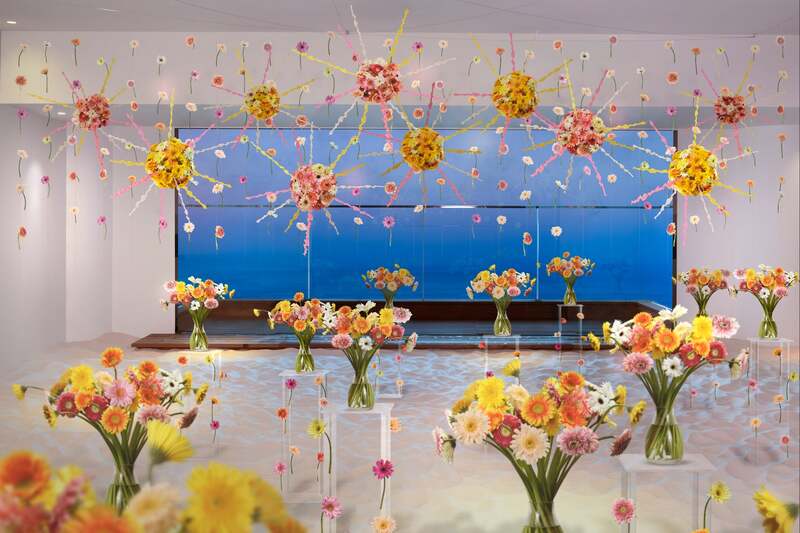 白砂が敷き詰められたフロア一面に、3000本以上のガーベラを使用した装飾が登場! フラワーボールは打ち上がる瞬間の花火を、フラワーカーテンは飛び散る火花をイメージしています。