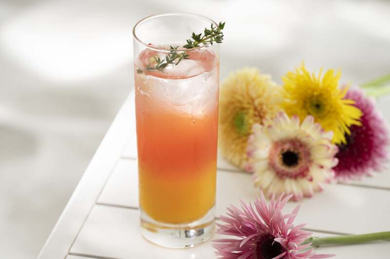 イベント期間中は、時間帯によって異なる2種類の限定モクテルを提供します。昼の時間帯(10:00〜17:00)は、ガーベラと花火に共通する豊富な色彩を3層で表現したモクテルを楽しめます。