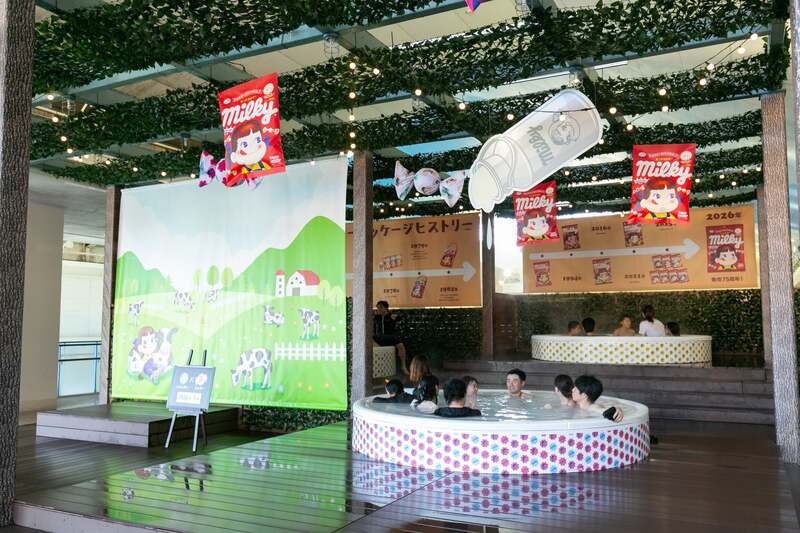 「カントリーマアム チョコまみれ風呂」やサウナイベント「#トトノウネクターロウリュ」に加え、今年は「ミルキー風呂」も登場。多彩な温泉体験が用意されています。