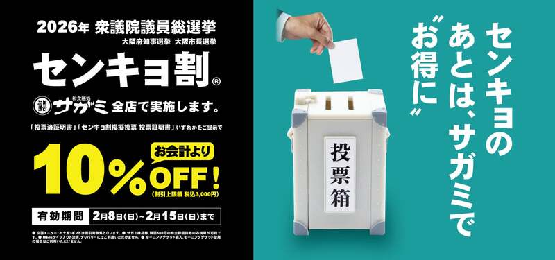 「和食麺処サガミ」や「味の民芸」などを展開するサガミホールディングスは、2026年2月の衆議院議員総選挙に合わせ、対象店舗で食事がお得になるキャンペーン「センキョ割」を実施します!