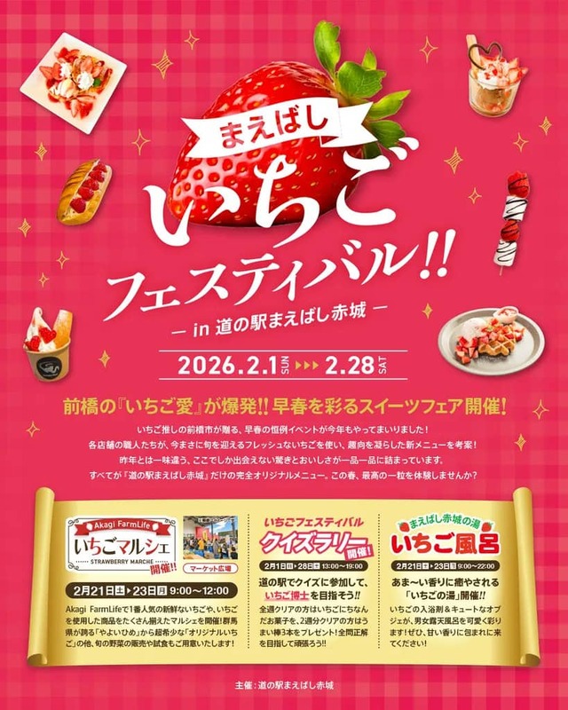 群馬県前橋市の「道の駅まえばし赤城」では、2026年2月1日(日)〜2月28日(土)の期間、「まえばしいちごフェスティバル -in 道の駅まえばし赤城-」が開催されています。