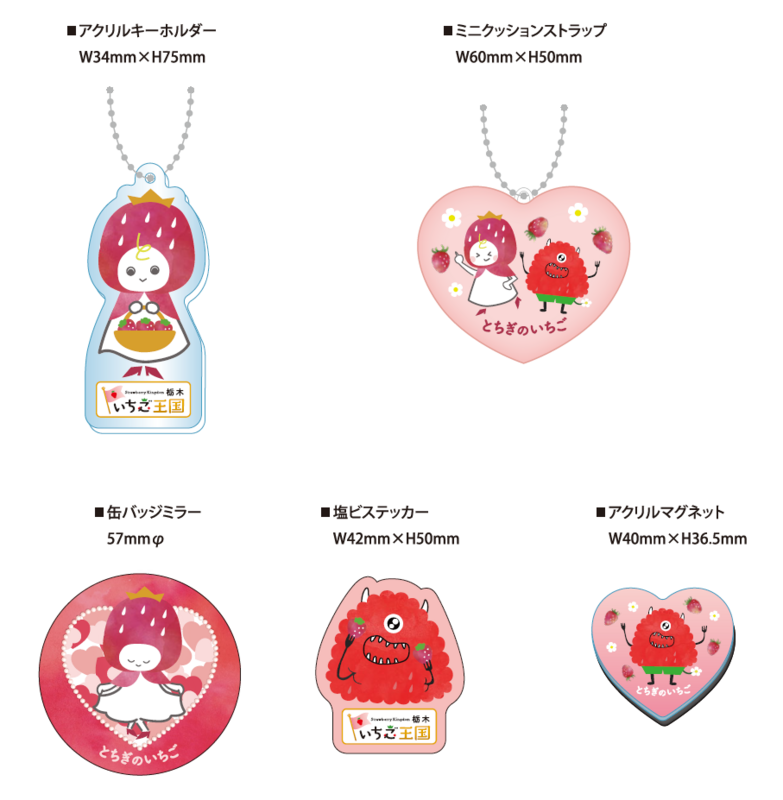 栃木県「いちご王国」のキャラクター「いちごちゃん」の缶バッジミラーやアクリルキーホルダー、「いちごモンスター」のステッカー、アクリルマグネット、ミニクッションストラップなど5種類の商品が当たります。※なくなり次第終了