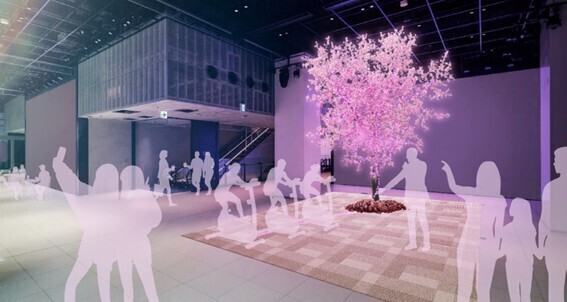 高さ4mの巨大な桜のイルミネーションが設置された会場では、3台の自転車をチームでこぎ、桜イルミネーションを輝かせる参加型の発電体験に無料で挑戦できます。