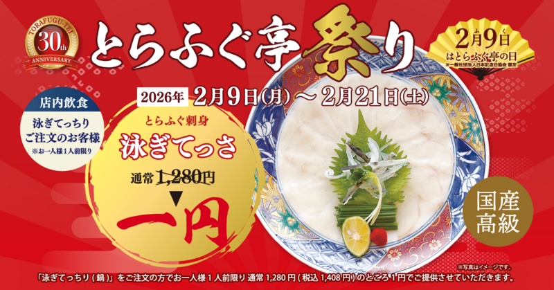 2月21日(土)まで、首都圏を中心に展開する「とらふぐ亭」全店で「とらふぐ亭祭り」が開催されています。