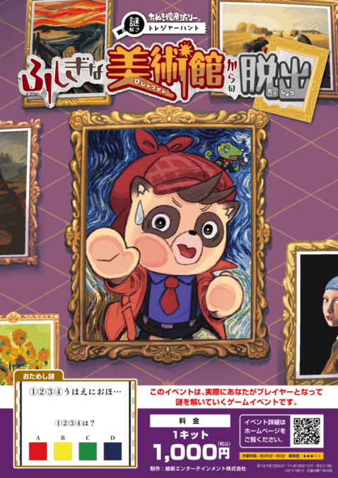 たぬき探偵ジェリーと一緒に、色が消えてしまった絵画の謎に挑む体験型イベントです。誰もいないはずの館内から声が聞こえたり、描かれていた動物がいなくなったりと、不思議な現象が起きる美術館を歩きながら推理を楽しみます。