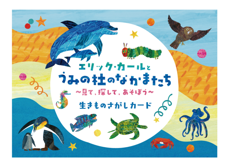 小さな絵本のようなカードを使って、「はらぺこあおむし」と一緒に館内のカラフルな生きものを探す「生きものさがしカード」も楽しめます(500円・税込)。