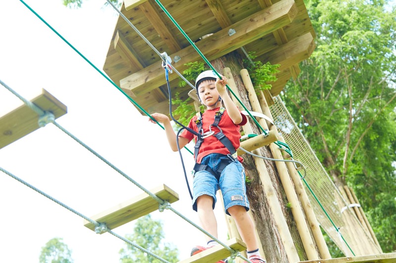 「こもれびアドベンチャー」は、自然の木を利用してつくられたフィールドアスレチック。