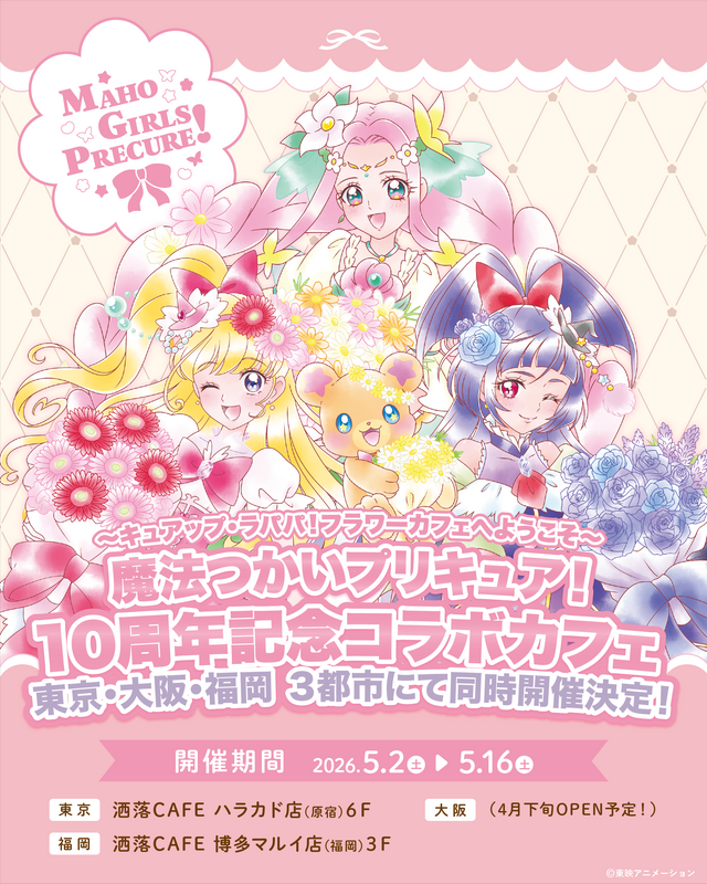 東京・原宿と福岡・博多、そして2026年4月下旬に新規オープン予定の大阪の「洒落CAFE」3店舗で、2026年5月2日(土)〜5月16日(土)まで、「魔法つかいプリキュア!」10周年記念コラボカフェ〜キュアップ・ラパパ!フラワーカフェへようこそ〜が開催されます。