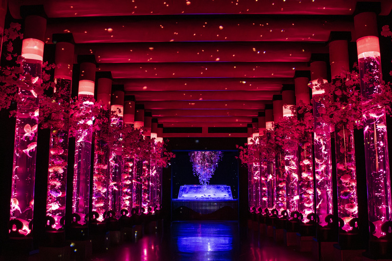 水が湧き出す泉を象徴した円柱水槽「金魚の湧泉」では、淡い色味の桜を重ねた繊細なグラデーションとともに、クリスタルやミラーが光を反射し、奥行きのある立体的な美しさが広がります。