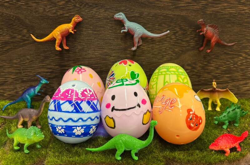 ファミリー館内特設会場では「ダイナソーズイースターエッグを作ろう」を開催。イースターエッグ型カプセルにオリジナルのペイントをして、好きな恐竜フィギュアを入れて持ち帰れます。料金は1個300円(卵1個+恐竜3個)です。