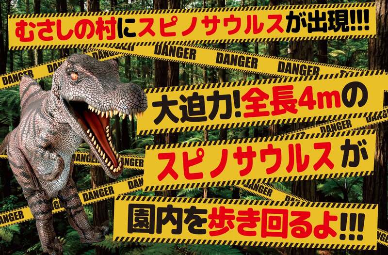 イベントのクライマックスは、4月4日(土)・5日(日)限定の「むさしの村にスピノサウルスが出現!!!」。全長4mの大迫力スピノサウルスが1日3回(11:00・13:00・15:00)、各回20〜25分程度、園内を歩き回ります。