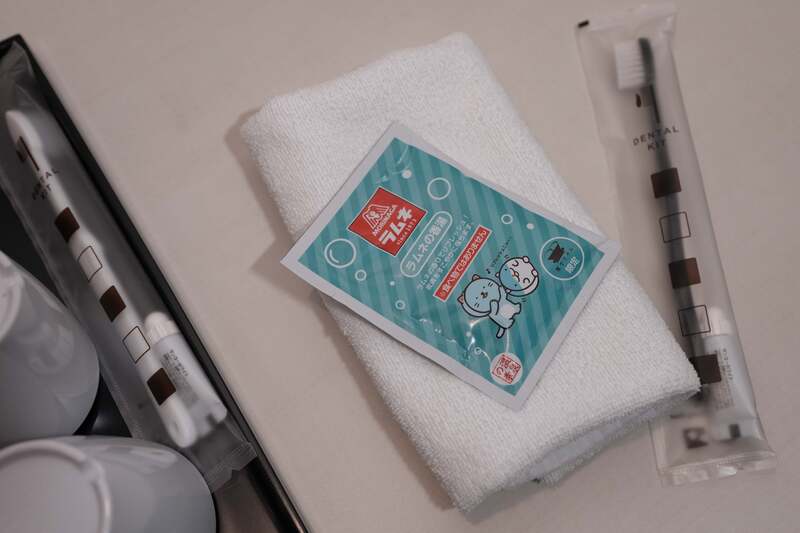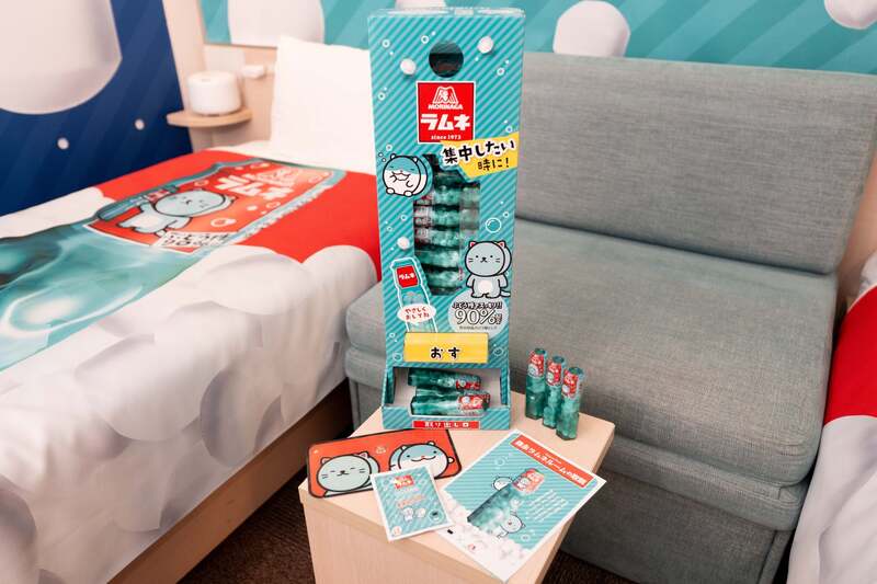 客室には、ラムネの香りを楽しむ入浴剤やアロマセット、「ラムねこ」と「しゅうチュー」のマスクケースなどのグッズが用意されています。