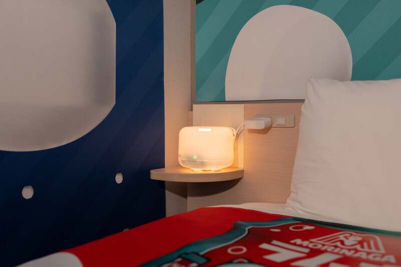 「森永ラムネルーム」は、ドア・壁・カーテン・ベッド・モニターまで、すべてが「森永ラムネ」の世界観でデザインされた客室です。