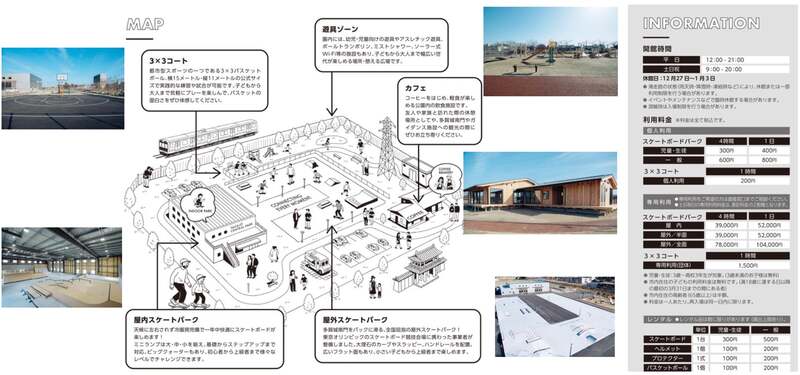 東北最大級スケートボードパークを中心に、3×3バスケットボールコート・遊具エリア・カフェを備えた、子供から大人まで楽しめる施設です。