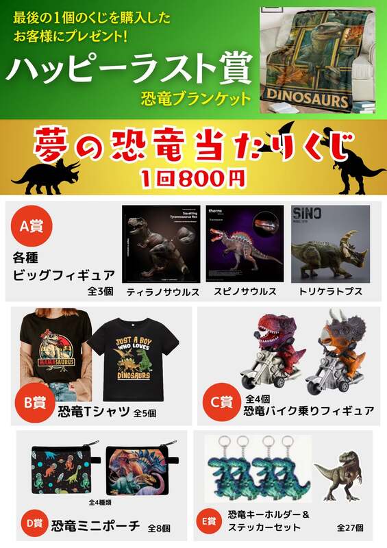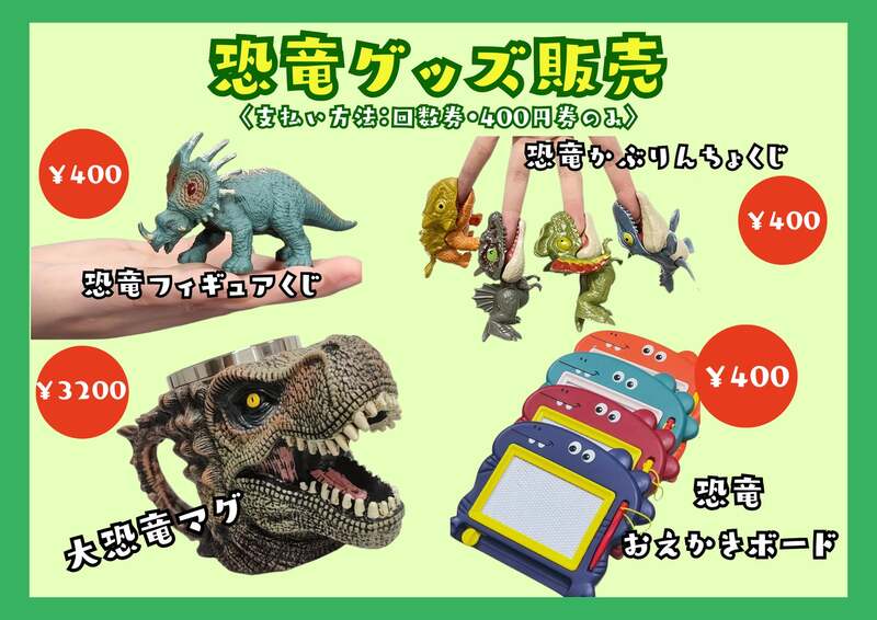 豪華景品が当たる「夢の恐竜あたりくじ」(1回800円)や、恐竜グッズ販売(400円〜)も展開されています。