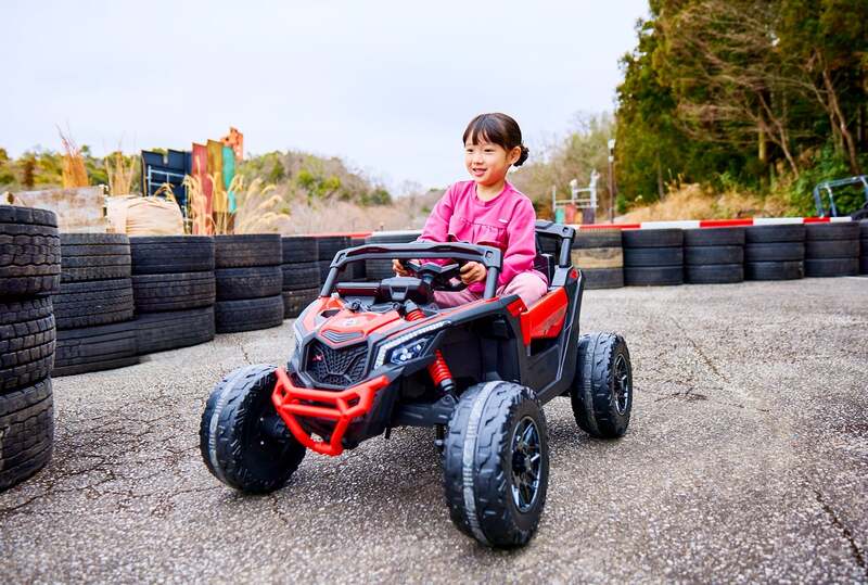 体験時間は約5分で、1Dayパスの対象です。エンジンの振動とオフロードの起伏を全身で感じながら、自分の手でバギーを操る爽快感が楽しめます。