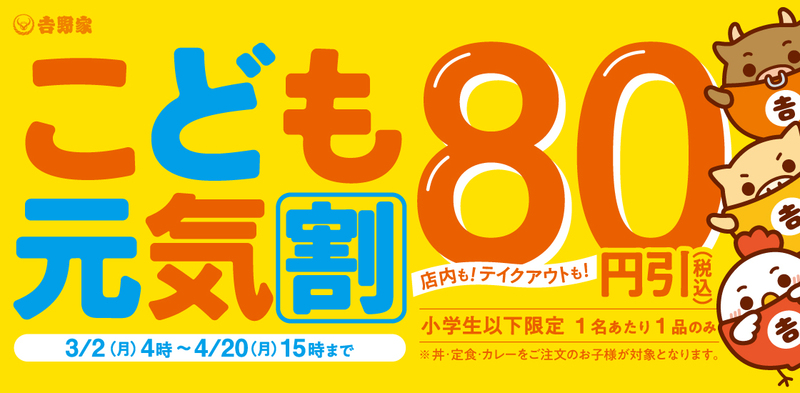 小学生以下を対象に、牛丼などの丼メニューや定食、カレー、お子さまメニューが税込価格から一律80円引きで提供される、春休みや新学期に心強いキャンペーンです。
