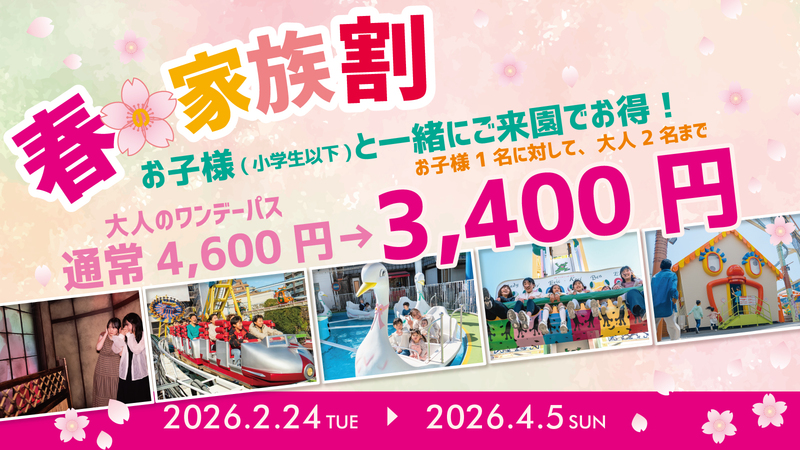 「春の家族割」は、小学生以下の子供1人につき大人2人まで、入園と乗り放題がセットになったワンデーパスが通常4,600円のところ、1,200円引きの3,400円で購入可能です。